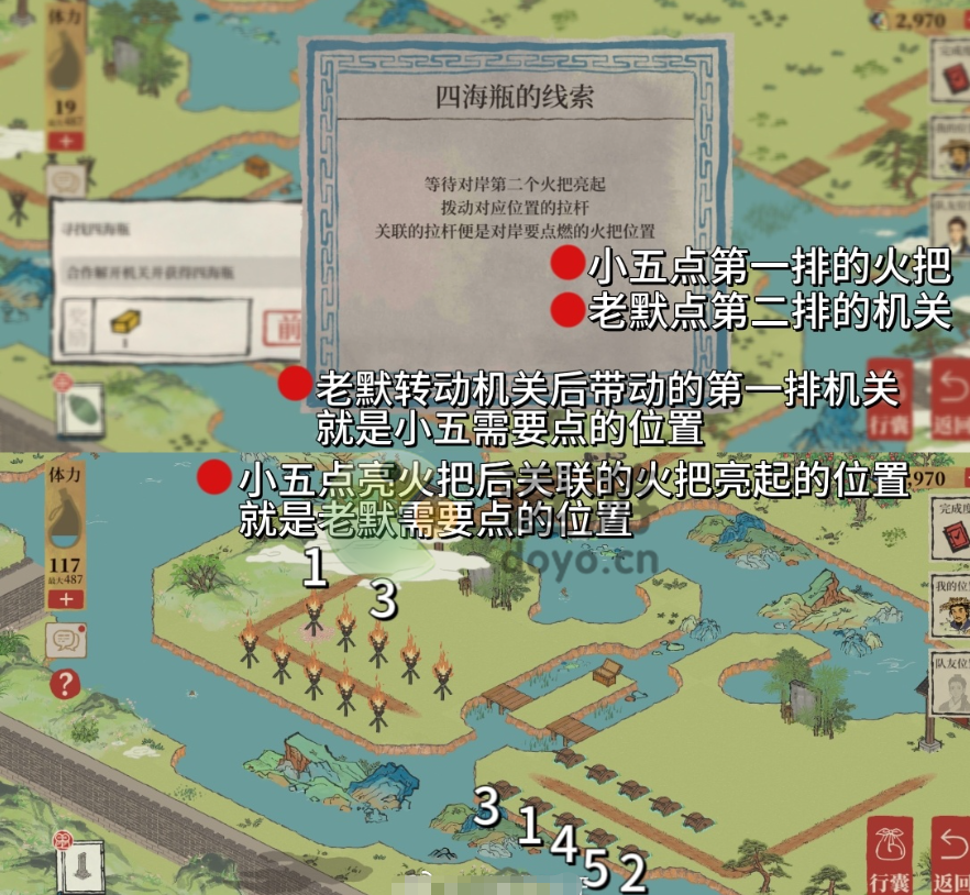 6、四海瓶的线索:两人配合交替操作,先点燃火把,再拉杆