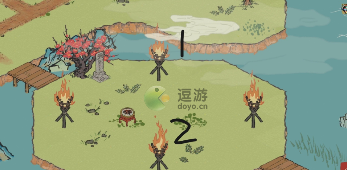 小五点亮火把后关联的火把亮起的位置,就是老默需要点的位置